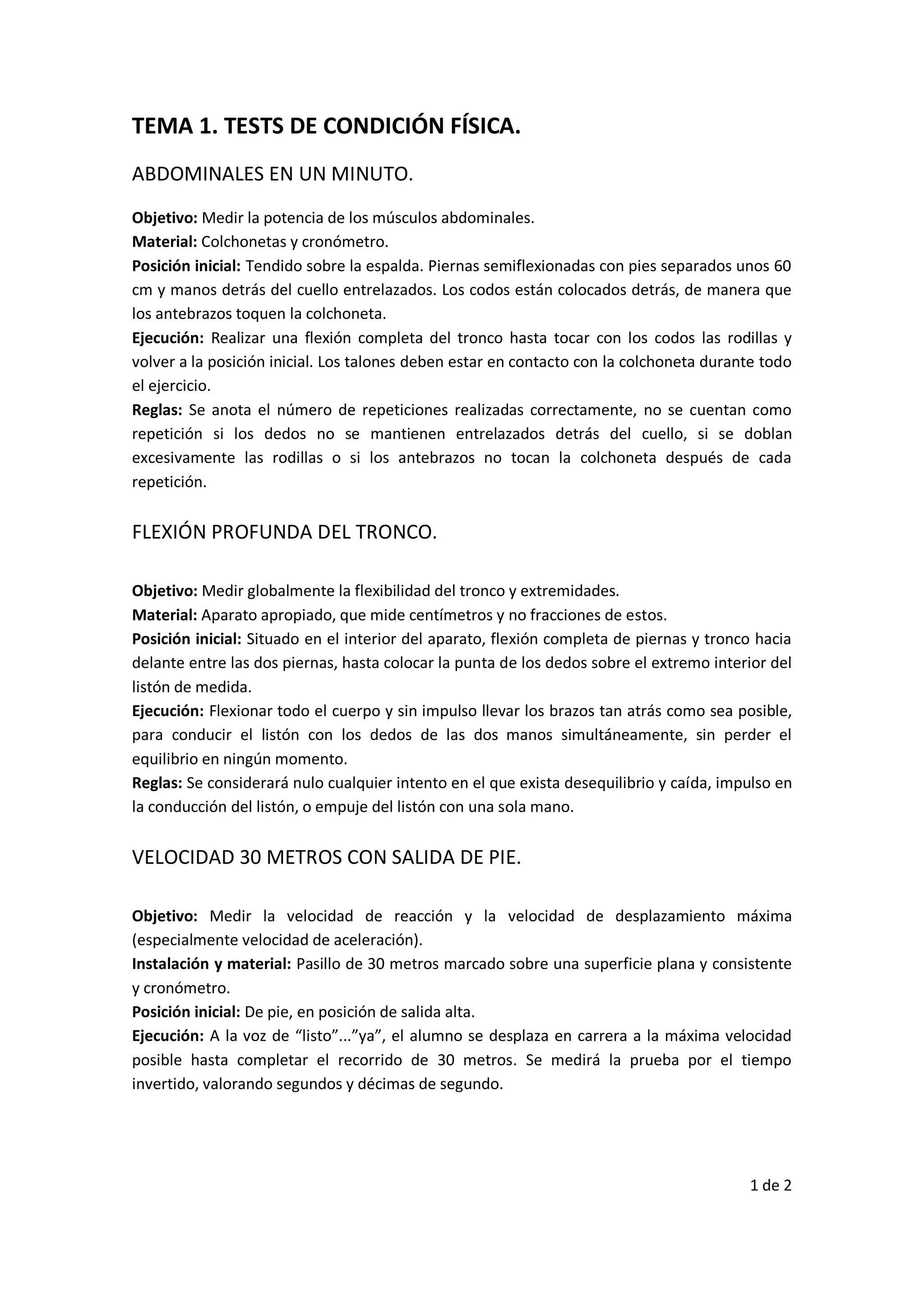Este documento presenta varias pruebas de condición física, incluyendo abdominales en un minuto para medir la fuerza abdominal, flexión profunda del tronco para medir la flexibilidad, una carrera de 30 metros desde parado para medir la velocidad de reacción y aceleración, salto horizontal para medir la potencia de las piernas, lanzamiento de balón medicinal para medir la potencia muscular general y biomecánica, y una carrera de fondo para medir la resistencia aeróbica. El documento describe los objetivos, material