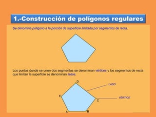 Este documento presenta los conceptos básicos de trazados geométricos en dibujo técnico para segundo año de ESO. Explica cómo construir polígonos regulares como triángulos, cuadrados y hexágonos, y describe polígonos estrellados y transformaciones geométricas como semejanza, traslación y simetría.