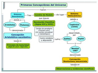 El documento presenta la evolución del entendimiento del universo desde una perspectiva antropocéntrica hasta la teoría heliocéntrica de Copérnico, abordando contribuciones de científicos como Galileo, Kepler y Newton. Además, describe la formación del sistema solar y la Tierra, considerando la teoría planetesimal y la evolución de las estrellas, así como la expansión del universo revelada por Hubble. Finalmente, se menciona la síntesis prebiótica que llevó a la aparición de la vida en la Tierra.