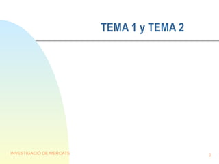 El documento describe las etapas de una investigación de mercados, incluyendo el diseño, recogida y análisis de datos, y la conclusión e informe final. Explica los tipos de preguntas que se pueden incluir en un cuestionario como preguntas abiertas, cerradas, dicotómicas, de múltiple elección y escalas. También describe las escalas de medida como nominal, ordinal, de intervalo y proporcional que se pueden usar para codificar las variables.