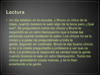 El documento contiene varias secciones breves sobre diferentes temas. Una sección describe un incidente en el que los niños aprenden que cuando se bosteza sale vaho de la boca. Otra explica palabras compuestas y las letras g y u. Otra lista las reglas de ortografía para la letra g. Finalmente, brevemente define pronombres personales, describir y dar instrucciones.