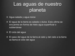 El documento habla sobre las aguas del planeta. Describe que el agua puede ser salada o dulce, y que el agua dulce se encuentra en forma de hielo, agua superficial o subterránea. También explica el ciclo del agua y cómo obtenemos el agua dulce a través de embalses, pozos y galerías. Finalmente, menciona que la contaminación de las aguas es uno de los problemas ambientales más graves actuales.