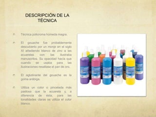 El documento describe la técnica del gouache, una técnica pictórica húmeda opaca descubierta en el siglo XI. Explica cómo se usa, incluyendo que se presenta en tubos o botes, requiere pinceles finos y papel o cartón encolado como soporte, y menciona artistas destacados como Durero, Boucher, Turner, Toulouse-Lautrec y Picasso.