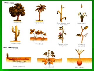 Este documento describe las características generales de las plantas, incluyendo su nutrición a través de la fotosíntesis, el transporte de nutrientes, la clasificación de plantas y los detalles sobre hepáticas, musgos, helechos, gimnospermas y angiospermas. Explica los procesos de polinización, fecundación, formación de semillas y frutos, y dispersión de semillas en el ciclo vital de las plantas.