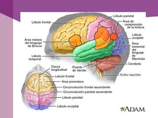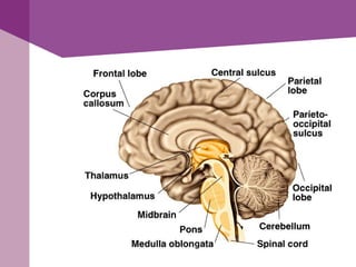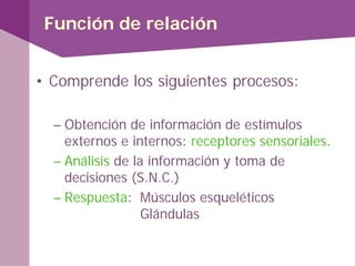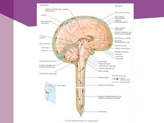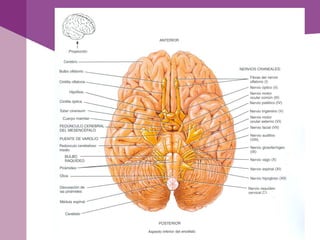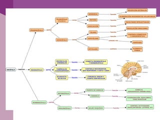 El documento describe la anatomía y fisiología del sistema nervioso. Explica que el sistema nervioso está formado por el sistema nervioso central (encéfalo y médula espinal) y el sistema nervioso periférico. El encéfalo se divide en telencéfalo, diencéfalo, mesencéfalo y rombencéfalo. El sistema nervioso se encarga de conectar los receptores sensoriales, los centros nerviosos y los órganos efectores, y de conducir y procesar la información a través de