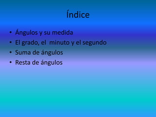 Este documento habla sobre los ángulos, su medida y clasificación. Explica que los ángulos se miden en grados, y que para mayor precisión también se usan minutos y segundos. Además, cubre cómo sumar y restar ángulos usando el sistema sexagesimal.