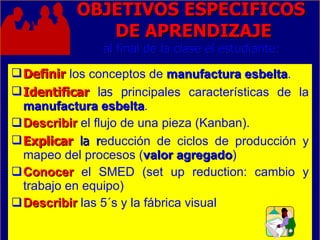 El documento describe los conceptos y herramientas de la manufactura esbelta. Define la manufactura esbelta como un conjunto de herramientas para eliminar operaciones que no agregan valor. Explica que surgió en Japón inspirada en Toyota y que ahora es adoptada globalmente. Describe herramientas como 5S, JIT, kanban, TPM y kaizen para eliminar desperdicios y mejorar la eficiencia.