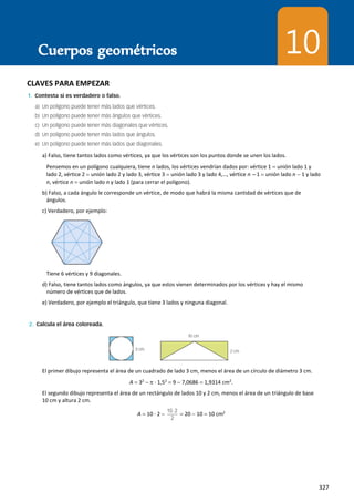 El documento presenta información sobre cuerpos geométricos como polígonos, poliedros y pirámides. Incluye definiciones, ejemplos y ejercicios para calcular áreas. Se explican conceptos como vértices, lados, diagonales, caras y fórmulas como la de Euler para poliedros convexos. También contiene cálculos para determinar áreas de figuras como hexágonos, triángulos y pirámides.