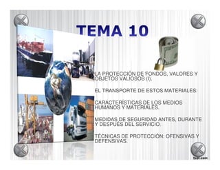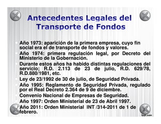 El documento describe los procedimientos y requisitos para el transporte seguro de fondos, valores y objetos valiosos por parte de empresas de seguridad privada en España. En particular, detalla los requisitos para los vehículos blindados, el equipo de seguridad que los acompaña, y las normas para realizar el transporte de manera segura dependiendo del valor de los objetos transportados.