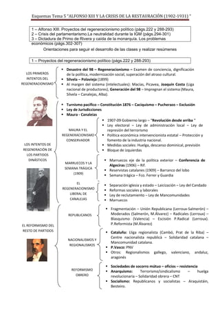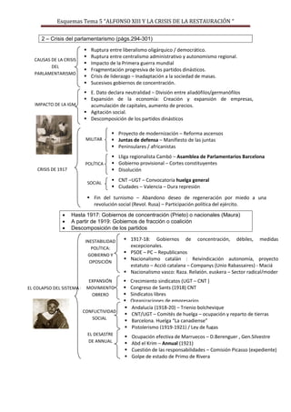 Este documento resume el periodo de 1902 a 1931 en España, que incluyó los intentos fallidos de regeneración política bajo Alfonso XIII, la crisis del parlamentarismo y la neutralidad en la Primera Guerra Mundial, la dictadura de Primo de Rivera de 1923 a 1930, y la caída subsecuente de la monarquía con el establecimiento de la Segunda República en 1931.