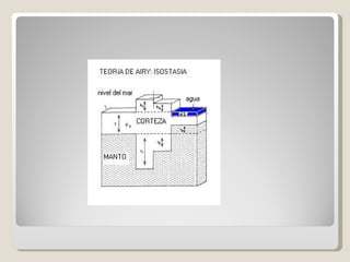 El documento describe la estructura interna de la Tierra. Se divide en unidades geoquímicas y dinámicas como la corteza, el manto y el núcleo. La corteza continental es más gruesa y menos densa que la oceánica. El manto representa el 83% del volumen terrestre y está dividido en superior e inferior. El núcleo interno es sólido y el externo líquido, generando el campo magnético.