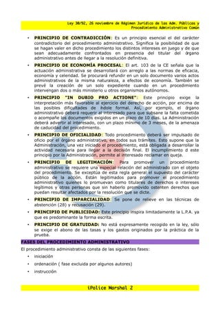 La ley 30/1992 establece el marco legal para el procedimiento administrativo en España. Introdujo cambios significativos respecto a la ley anterior de 1958 para adaptarla a las necesidades sociales. Establece los principios básicos del procedimiento como la contradicción, economía procesal, imparcialidad y publicidad. Define las fases del procedimiento como iniciación, ordenación, instrucción y terminación. Regula aspectos como las solicitudes, subsanación de errores, medidas provisionales y declaraciones responsables para agilizar trámites.