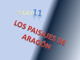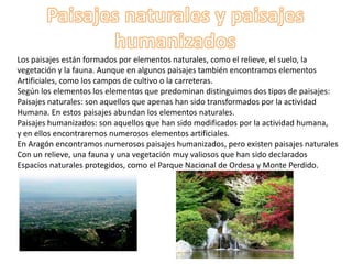Este documento describe los diferentes tipos de paisajes y elementos naturales que forman el paisaje en Aragón, incluyendo el relieve, ríos, clima, suelos, vegetación y fauna. Explica que Aragón tiene paisajes tanto naturales como humanizados, y destaca elementos como las montañas de los Pirineos y el Sistema Ibérico, la llanura del Ebro, y ríos importantes como el Ebro, Gallego y Cinca.
