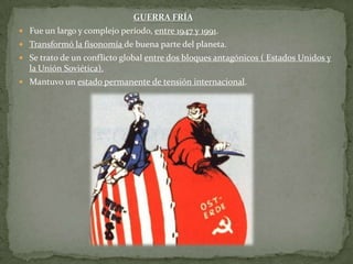 Este documento describe la Guerra Fría entre 1947 y 1991, caracterizada por la tensión entre los bloques capitalista liderado por Estados Unidos y el comunista liderado por la Unión Soviética. Se formaron los bloques a través de decisiones sobre la ocupación de Alemania y la desconfianza mutua creciente. La división del mundo en bloques condujo a conflictos como la Guerra de Corea y Vietnam, hasta que se logró una distensión en la década de 1960 con la coexistencia pacífica.