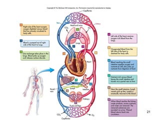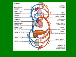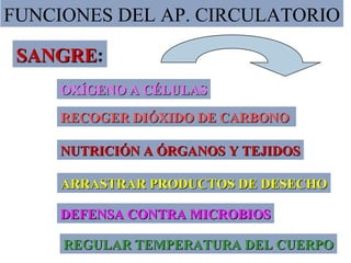 El documento resume las funciones y estructura del sistema circulatorio. Describe las partes del corazón, incluyendo las cavidades, válvulas y vasos principales. Explica cómo el corazón bombea la sangre a través de la circulación sistémica y pulmonar, suministrando oxígeno y nutrientes a los tejidos y removiendo dióxido de carbono y desechos. También describe los tipos de vasos sanguíneos, células sanguíneas y el sistema linfático.