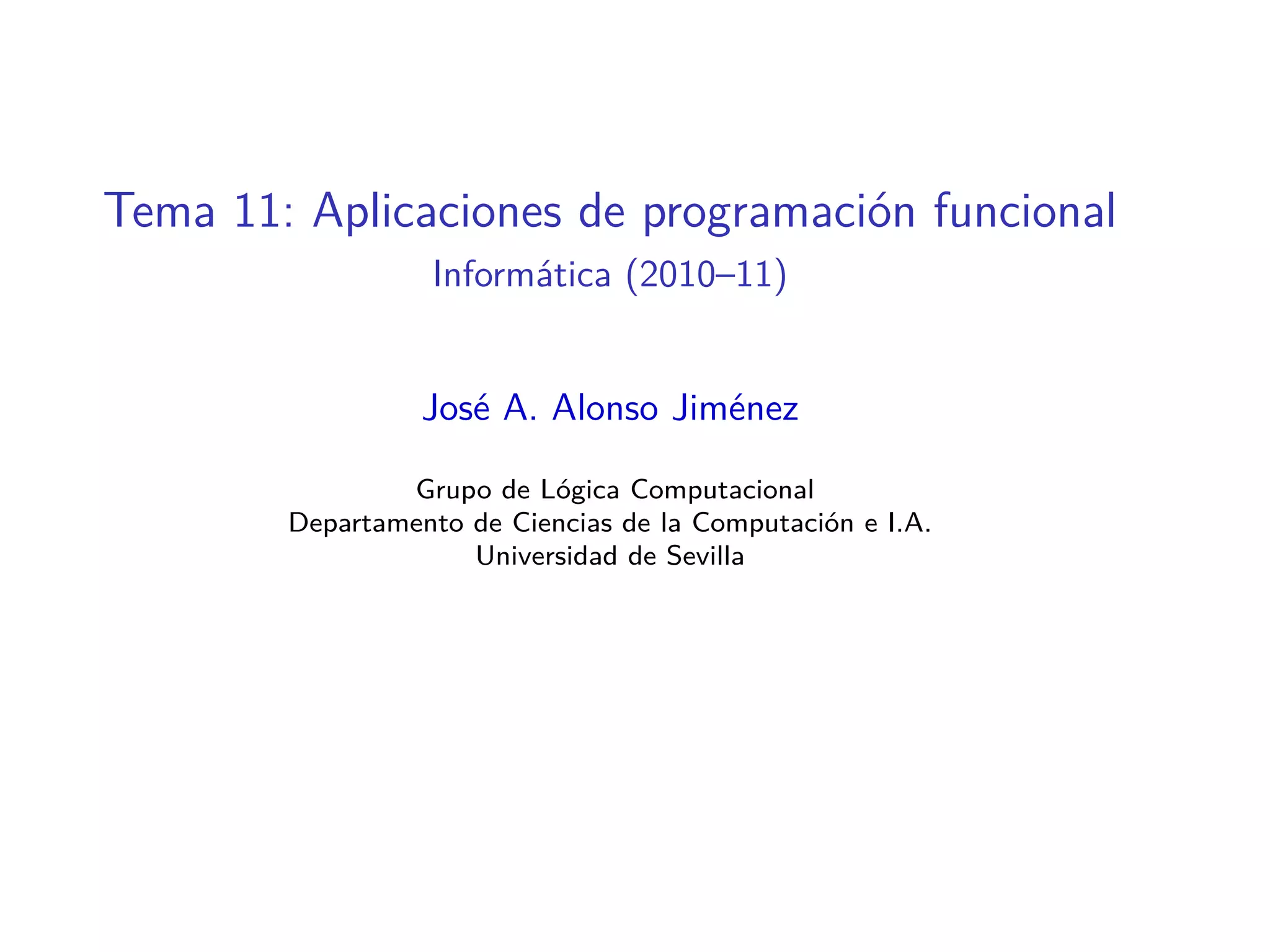 El documento trata sobre aplicaciones de programación funcional en el contexto de problemas computacionales, incluyendo el juego 'Cifras y Letras', el problema de las reinas y números de Hamming. Se discuten técnicas de búsqueda de soluciones como la fuerza bruta, así como métodos combinatorios para generar y evaluar expresiones matemáticas. Además, se presentan ejemplos de funciones combinatorias y estadísticas sobre la eficiencia de las búsquedas implementadas.