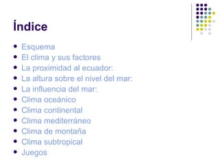 Este documento resume los diferentes tipos de clima que se dan en España y los factores que influyen en cada uno. Explica que el clima depende principalmente de la proximidad al ecuador, la altura sobre el nivel del mar y la influencia del mar. Luego describe brevemente los climas oceánico, continental, mediterráneo, de montaña y subtropical que se dan en el país, incluyendo sus características de temperatura y precipitaciones.