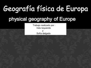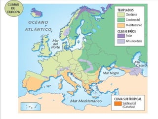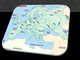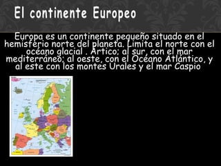 Este documento resume las características geográficas de Europa. Europa limita al norte con el Océano Ártico, al sur con el Mar Mediterráneo, al oeste con el Océano Atlántico y al este con los Montes Urales. Los principales accidentes geográficos son los Alpes, los Pirineos, los Cárpatos y los Balcanes. Los ríos más importantes desembocan en el Océano Ártico, el Atlántico, el Mediterráneo, el Mar Negro y el Mar Caspio.