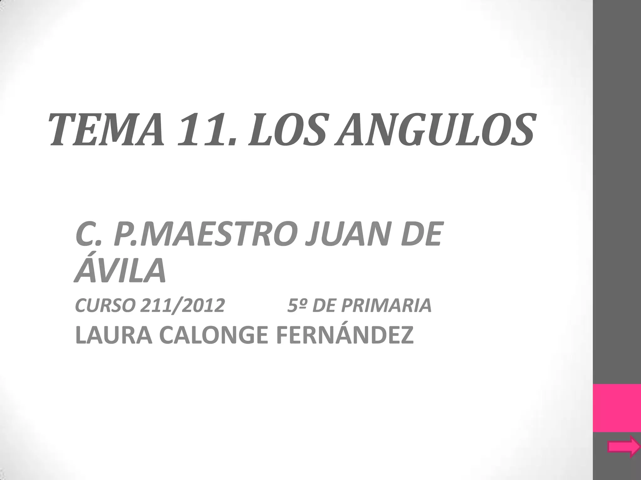 Este documento proporciona información sobre los diferentes tipos de ángulos. Explica que los ángulos pueden ser agudos, rectos, obtusos, llanos o completos según su abertura, y consecutivos, adyacentes u opuestos por el vértice según su posición. Además, detalla que los ángulos se miden en grados sexagesimales usando un transportador, y que dos ángulos son complementarios si suman 90 grados o suplementarios si suman 180 grados.