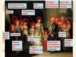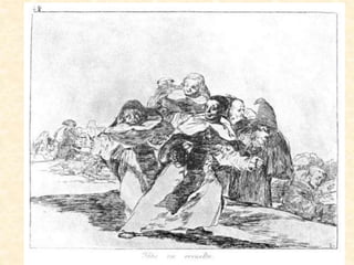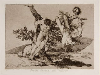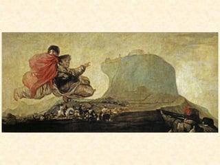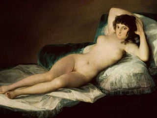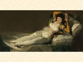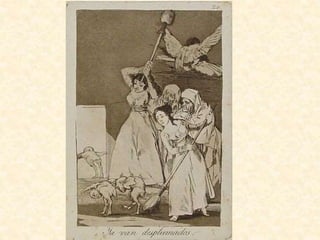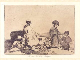 El documento resume la vida y obra del pintor Francisco de Goya. Comienza describiendo el contexto artístico del siglo XVIII y las características estilísticas de la pintura de la época como el gusto por lo pintoresco y lo costumbrista. Luego detalla la biografía de Goya y las diferentes etapas de su obra, desde sus primeros cartones para tapices hasta sus famosas series de grabados como Los Caprichos y Los Desastres de la Guerra. Finalmente, analiza su influencia en movimientos posteriores como el Romanticismo y el