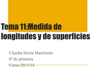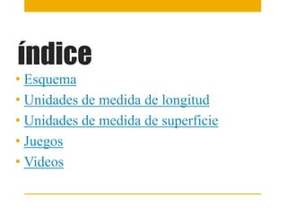 Este documento presenta información sobre las unidades de medida de longitud y superficie. Explica las principales unidades de medida de longitud como metros y centímetros, así como las unidades de medida de superficie como metros cuadrados y centímetros cuadrados. También incluye enlaces a juegos y videos relacionados con la medición de longitudes y superficies.