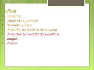 Este documento trata sobre la medida de longitudes y superficies. Explica que la longitud se mide en unidades lineales como el metro, mientras que la superficie se mide en unidades cuadradas como el metro cuadrado. También define el perímetro como la medida del contorno de una figura y el área como la medida de su superficie. Finalmente, detalla las principales unidades de medida del sistema métrico decimal para longitud y superficie, incluyendo múltiplos y submúltiplos.