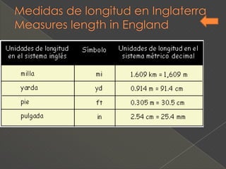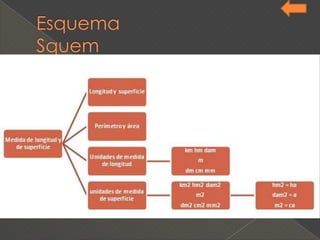 Este documento describe las unidades de medida de longitud y superficie en el sistema métrico decimal. Explica que la unidad principal de longitud es el metro y la de superficie es el metro cuadrado. También define perímetro y área, e indica que las unidades de longitud y superficie se organizan de forma incremental, aumentando o disminuyendo por potencias de 10 u 100 respectivamente. Finalmente, menciona algunas unidades agrarias comunes.