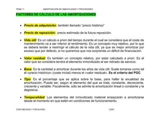 El documento habla sobre la amortización del inmovilizado y las provisiones. Explica que la amortización es la depreciación sistemática e irreversible que sufre el inmovilizado al ser usado en el proceso productivo, y que representa un gasto aunque no implique una salida de efectivo a corto plazo. Luego describe diferentes métodos de cálculo de la amortización como la lineal, degresiva y por suma de dígitos, y especifica cuales son admitidos fiscalmente. Finalmente, comenta cómo se contabilizan las amortiz