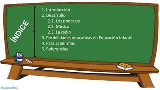 El documento aborda la creación y uso de podcasts, destacando su naturaleza como archivos de audio y video que se distribuyen a través de RSS, así como las herramientas necesarias para producirlos. También se menciona la radio como un medio de difusión masivo y las posibilidades educativas que ofrecen las radios escolares. Se analizan las ventajas y desventajas de los podcasts y la radio en contextos educativos.