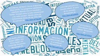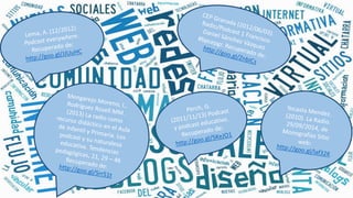 El documento describe varias actividades y recursos relacionados con la creación de podcasts y radio escolar para combinar las TIC con materiales tradicionales. Incluye enlaces a actividades sobre cuentos como La oruga glotona e Incy Wincy Spider, así como sobre el Arca de Noé, sonidos de animales, y un corro de animales. También proporciona enlaces sobre la creación de podcasts educativos, el uso de Spotify y SoundCloud en el aula, y artículos sobre usar la radio como recurso didáctico.