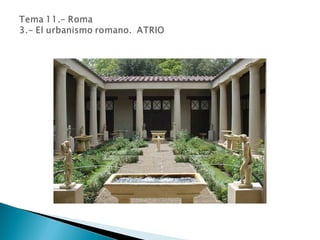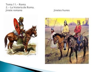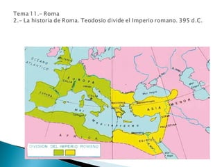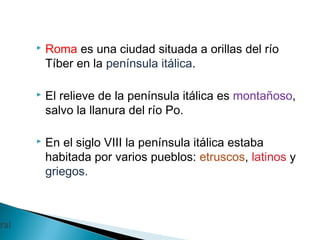 El documento resume la historia de Roma desde su fundación por Rómulo hasta la caída del Imperio Romano de Occidente. Explica que Roma se ubicó en la península itálica y pasó por tres etapas políticas: la Monarquía, la República y el Imperio. Durante la República, Roma se expandió territorialmente y derrotó a Cartago, mientras que durante el Imperio alcanzó su máxima extensión bajo el mando de Augusto.
