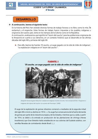 El documento describe la explotación de los pueblos indígenas durante el "boom del caucho" en la Amazonía peruana entre finales del siglo XIX y principios del siglo XX. Las compañías caucheras sometieron a los pueblos indígenas como los Bora, Huitoto y Ocaina a formas de trabajo forzoso como la deuda perpetua y el castigo físico para extraer caucho de forma masiva. Esto tuvo consecuencias devastadoras para los pueblos indígenas como muertes, traslados for