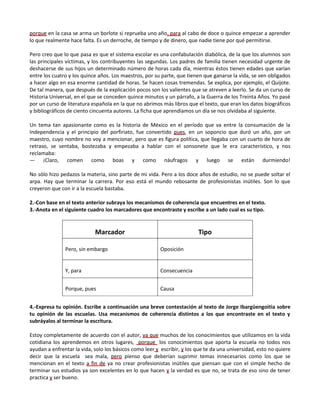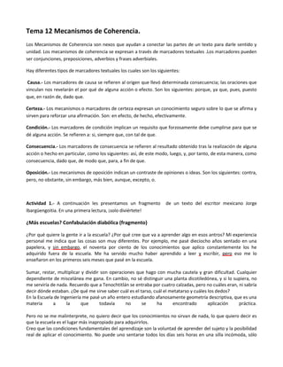 Este documento presenta los diferentes tipos de mecanismos de coherencia que ayudan a conectar las partes de un texto. Explica que los mecanismos de coherencia se expresan a través de marcadores textuales como conjunciones, preposiciones y adverbios. Luego enumera y define los diferentes tipos de marcadores, incluyendo los de causa, certeza, condición, consecuencia y oposición.