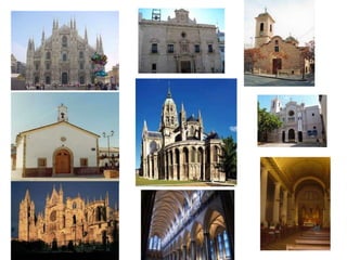 Este documento presenta información sobre diferentes formas de arte religioso como la pintura, escultura y arquitectura. Explica los símbolismos de los colores en la pintura y los materiales utilizados en la escultura. Incluye ejemplos de obras pictóricas famosas y muestra fotografías de esculturas y edificios arquitectónicos religiosos. El documento también propone actividades para que los lectores exploren más a fondo estos temas artísticos.