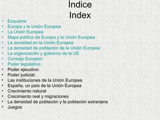 Este documento proporciona información sobre la sociedad en Europa y España. Resume que la Unión Europea tiene una población de 500 millones de personas distribuidas en una superficie de 5,215,000 km2, con una densidad de 115 hab/km2. La UE tiene bajo crecimiento natural pero alto crecimiento real debido a la inmigración. La UE está gobernada por instituciones como el Consejo Europeo, el Parlamento Europeo, la Comisión Europea y el Tribunal de Justicia Europeo. España, como miembro de la UE, tiene una población