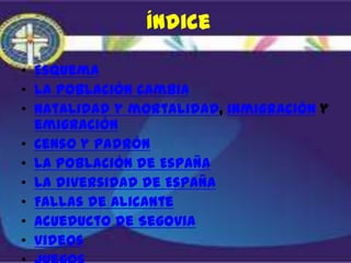 Este documento trata sobre la población y cómo cambia debido a factores como la natalidad, mortalidad, inmigración y emigración. Explica conceptos como crecimiento natural, censo y padrón. También describe brevemente la distribución de la población en España y su diversidad cultural y lingüística.