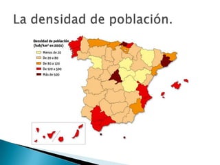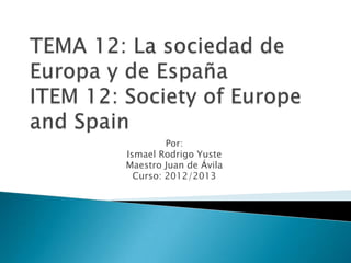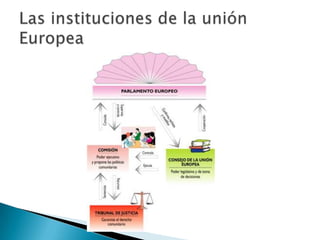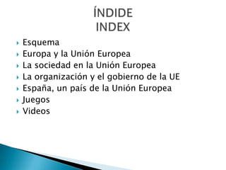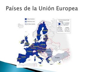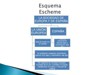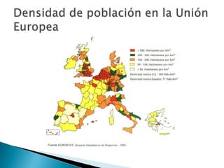 El documento describe la Unión Europea, que está formada por 27 países democráticos de Europa. Explica que la población de la UE vive principalmente en ciudades y recibe muchos inmigrantes. También describe la organización política de la UE, incluyendo el Consejo Europeo, el Parlamento Europeo, el Consejo de la UE, la Comisión Europea, el Tribunal de Justicia Europeo y el Tribunal de Cuentas Europeo. Además, señala que la población española se concentra en las zonas costeras y en Madrid, y que el cre