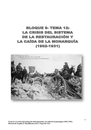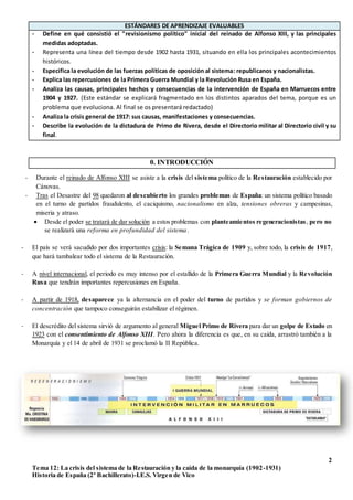 Este documento resume la crisis del sistema político de la Restauración en España entre 1902 y 1931. Explica que los gobiernos iniciales de Alfonso XIII intentaron reformas regeneracionistas para modernizar el país, pero que no lograron estabilizar el régimen. También describe el crecimiento de fuerzas opositoras como los republicanos y nacionalistas, y las crisis de 1917 y 1923 que llevaron al golpe de estado de Primo de Rivera y finalmente a la caída de la monarquía en 1931 con la proclamación de la Segunda República.