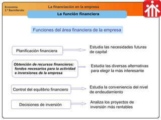 Este documento describe las diferentes fuentes de financiación de las empresas, incluyendo la financiación interna (autofinanciación) y externa (fondos ajenos). Explica los tipos de reservas que permiten la autofinanciación, así como las diferentes opciones de financiación externa a corto y largo plazo, como préstamos bancarios, emisión de obligaciones y el mercado de valores.