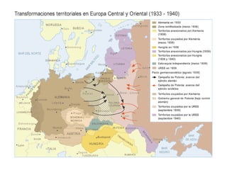 1) El documento resume los orígenes y desarrollo de la Segunda Guerra Mundial entre 1939 y 1945, incluyendo la expansión alemana inicial, la ofensiva alemana entre 1940-1942, la reacción aliada entre 1942-1945 y las consecuencias del conflicto.