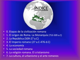 El documento proporciona una descripción general de la civilización romana, incluyendo sus orígenes en la Monarquía, el establecimiento de la República y su expansión a través de conquistas militares, el surgimiento del Imperio y su posterior división, así como detalles sobre la economía, sociedad, religión y cultura de Roma.