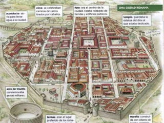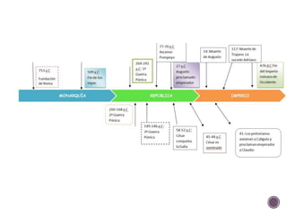 El documento resume el origen y desarrollo de Roma y su Imperio. Comenzó como una ciudad-estado fundada por Rómulo en el siglo VIII a.C. en la Península Itálica. Con el tiempo, Roma se expandió para conquistar toda Italia y el Mediterráneo occidental, estableciendo la Pax Romana. El Imperio Romano alcanzó su máxima extensión bajo emperadores como Augusto antes de dividirse y sufrir una crisis que condujo a su caída en el siglo V d.C.