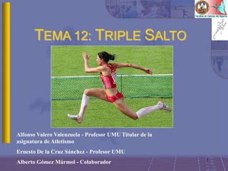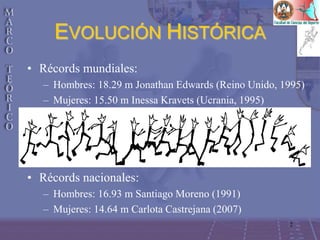 El documento describe la evolución histórica y técnica del triple salto. Explica que surgió de malas interpretaciones de saltos griegos y que hasta el siglo XIX no se estandarizó la técnica. Describe la evolución de récords y la incorporación a los Juegos Olímpicos. Explica las técnicas escocesa, irlandesa y griega, y la evolución hacia las escuelas americana, japonesa, soviética y polaca en el siglo XX. Finalmente, detalla la reglamentación, descrip