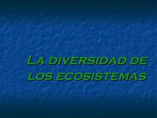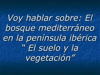 El documento habla sobre los ecosistemas del bosque mediterráneo en la península ibérica, describiendo específicamente el suelo y la vegetación. Explica que los suelos son pobres debido al calor y las lluvias torrenciales, y la importancia de protegerlos. Describe la gran diversidad vegetal resultado de la variedad geológica, climática y transición entre regiones, con especies dominantes como la encina, roble y vegetación xerófila. También discute la degradación histórica de los bosques