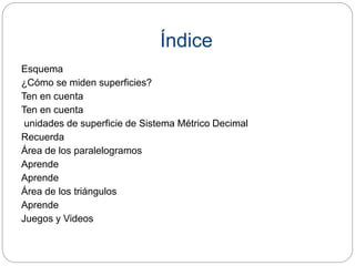 Este documento proporciona instrucciones sobre cómo medir superficies. Explica que la superficie se mide en unidades cuadradas y que el área de una figura es el número de unidades cuadradas que ocupa. Detalla las unidades de medida del sistema métrico decimal para superficies y cómo calcular el área de figuras como rectángulos, rombos, triángulos y trapecios multiplicando la base por la altura. También incluye enlaces a juegos y videos sobre el tema.