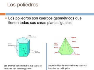 Este documento trata sobre los cuerpos geométricos y el volumen. Explica que los poliedros tienen caras planas iguales, como los prismas y las pirámides. También describe los cuerpos de revolución como el cilindro, el cono y la esfera. Finalmente, define el volumen como la cantidad de espacio ocupado por un cuerpo y las unidades para medirlo, como el metro cúbico, decímetro cúbico y centímetro cúbico.