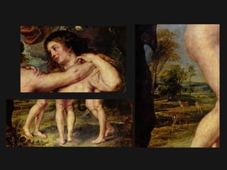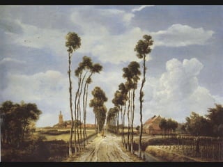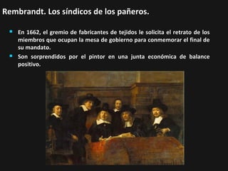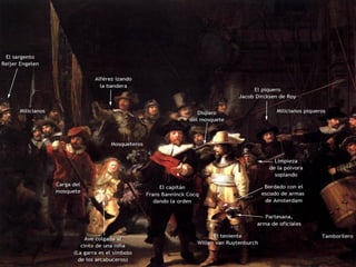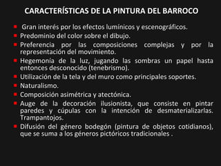 Este documento describe las características de la pintura barroca en Italia y los Países Bajos. Se analizan los estilos y obras maestras de Caravaggio, Rubens y Rembrandt, así como otros pintores como Van Dyck y Frans Hals. También se mencionan las diferencias entre la pintura barroca de Bélgica, dominada por temas religiosos, y la de Holanda, más realista y centrada en géneros como el paisaje y el retrato.