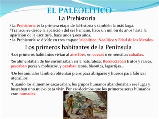 El documento proporciona información sobre la prehistoria en la región de Murcia. Explica que los primeros habitantes vivían en cuevas y se alimentaban de la caza y la recolección. Luego, durante el Neolítico, la gente comenzó a practicar la agricultura, la ganadería y a vivir en aldeas. Finalmente, en la Edad de los Metales se construyeron poblados amurallados y se desarrollaron oficios como la metalurgia y la cerámica. Un importante yacimiento arqueológico de este per