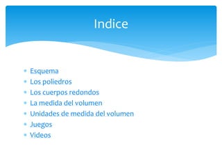 Este documento trata sobre los cuerpos geométricos y su volumen. Explica los poliedros como cuerpos con caras planas, incluyendo prismas y pirámides. También cubre los cuerpos redondos como cilindros, conos y esferas. Finalmente, define el volumen como la cantidad de espacio ocupado por un cuerpo y explica cómo medirlo usando unidades cúbicas, así como las unidades comunes de medida de volumen.