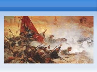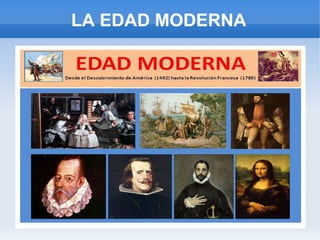 El documento resume los principales acontecimientos de la Edad Moderna en España, incluyendo la conquista de América en el siglo XV bajo los Reyes Católicos, la organización de los nuevos territorios en virreinatos y audiencias, y el establecimiento del Imperio Español como la entidad más poderosa de la época. Sin embargo, el imperio comenzó a fragmentarse en los siglos posteriores debido a guerras y la llegada de los Borbones al trono, dando paso a cambios políticos y sociales.